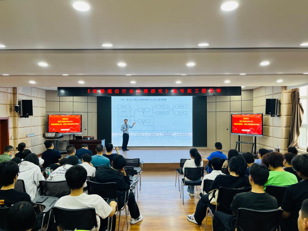 4月23日,电信工程系邀请了中国通号工程局集团公司天津分公司责任成本部部长、高级工程师程景奇到校交流指导,并以“铁路通信行业发展探究”为主题在智慧大讲堂开展了技术讲座。校长、党委副书记于庆斌,电信工程系党支部书记、主任李琼,信息工程系党支部书记、主任邱智铖,电信工程系教学主任李军华,以及电信工程系师生近100余人聆听了讲座。