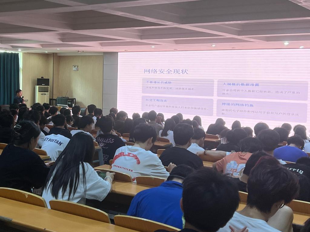 讲座伊始,张斌首先从网络安全的定义入手,深入浅出地讲解了网络安全的基本概念及其重要性。随后,他对病毒攻击、数据泄露、网络钓鱼等主要网络威胁进行了详细分析,并且通过生动的案例,向学生们展示了这些威胁的严重性和危害性。在网络安全意识的培养方面,张斌提出了几点实用建议:一是养成良好的网络使用习惯,不随意点击不明链接或下载未知文件;二是定期更新密码,避免使用简单密码;三是加强个人信息保护,不轻易泄露个人隐私。他还特别提醒学生,网络诈骗手段层出不穷,一定要做到“不轻信、不透露、不转账”,遇到可疑情况及时向相关部门求助。