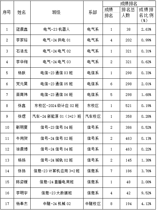依据河南省教育厅下发评审工作通知,经学生自主申请,学工部与各系组织评定小组进行评审,2024-2025学年我校中职国家奖学金评定结果如下: