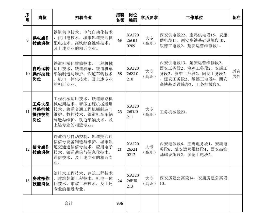 本次计划招聘936人,招聘岗位均为铁路运输生产一线操作技能岗位。招聘岗位、专业、工作地点及人数等内容详见附件。