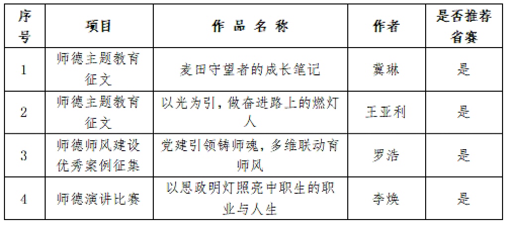 根据全省教育系统“铸魂强师,奋进有我”师德主题教育活动安排部署,学校组织开展了师德主题教育征文、师德师风建设优秀案例征集和师德演讲比赛等活动的评选工作。经学校集中评审打分,现将具体结果公示如下: