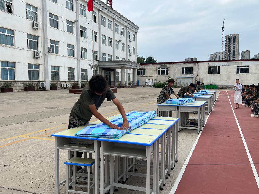 会操现场,学生们洋溢着青春的光彩。8支新生方队身着统一军训服,已然保持着整齐的坐姿。从起步到立定,从转体到敬礼,每个方队动作精准同步。军体拳方队动作刚劲利落,一招一式尽显少年锐气。内务整理更是展现出学生们对于细节的精准把控,动作娴熟连贯。学生精彩展示后,评委老师们公正打分,评选出两名优秀班集体、八名训练标兵和八名内务标兵。