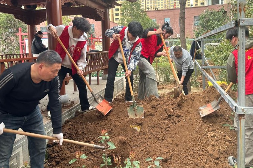 在老师们的带领下,志愿者们首先来到常村社区开展服务。同学们手持扫帚、抹布等工具,分组清理街道垃圾、擦拭公共设施。具备摄影特长的志愿者走街串巷开展爱心生活照活动,先后为15位老人、儿童提供义务拍照服务,细致周到的服务赢得居民连连称赞。随后在康庄社区,志愿者们积极参与到植树节社区活动当中,与社区工作人员共同栽种了十余株景观苗木,参与植树的志愿者们挥锹铲土、扶苗培土、提水浇灌。劳动中,社区工作人员还向大家介绍了树株的品种、植树技巧以及树木养护的方法,现场气氛十分热烈。老师们时不时与身边的同学们交谈,了解大家对开展植树、参与劳动的看法,鼓励同学们在学习之余多参加劳动。新绿的树苗与鲜艳的志愿马甲交相辉映,为社区增添了勃勃生机。