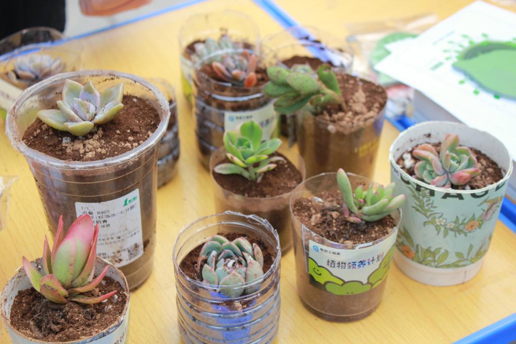 活动还鼓励师生用收集的废旧塑料瓶等,兑换植物种子卡或领养多肉植物。大家把领养的种子或多肉植物种在这些塑料瓶里,贴上定制环保杯贴,塑料瓶就变成了独特的小花盆,加上活动赠送的咖啡渣和营养土,为多肉植物打造一个漂亮的“新家”。