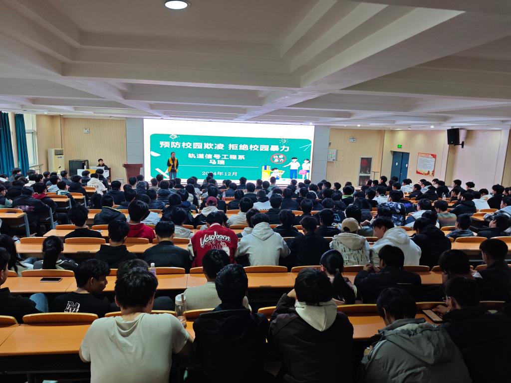 为进一步筑牢校园安全防线,规范学生行为,预防校园欺凌和校园暴力事件的发生,建立和谐文明积极向上的校园文化,12月2日下午,轨道信号工程系在我校思政大讲堂举办《预防校园欺凌,拒绝校园暴力》的专题讲座,本次讲座由轨道信号工程系学管主任马瑞主讲,轨道信号工程系全体班长、宿舍长,学生项目组等将近200名学生参加了讲座。