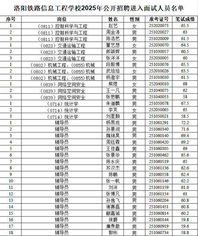 附件:洛阳铁路信息工程学校2025年公开招聘进入面试人员名单