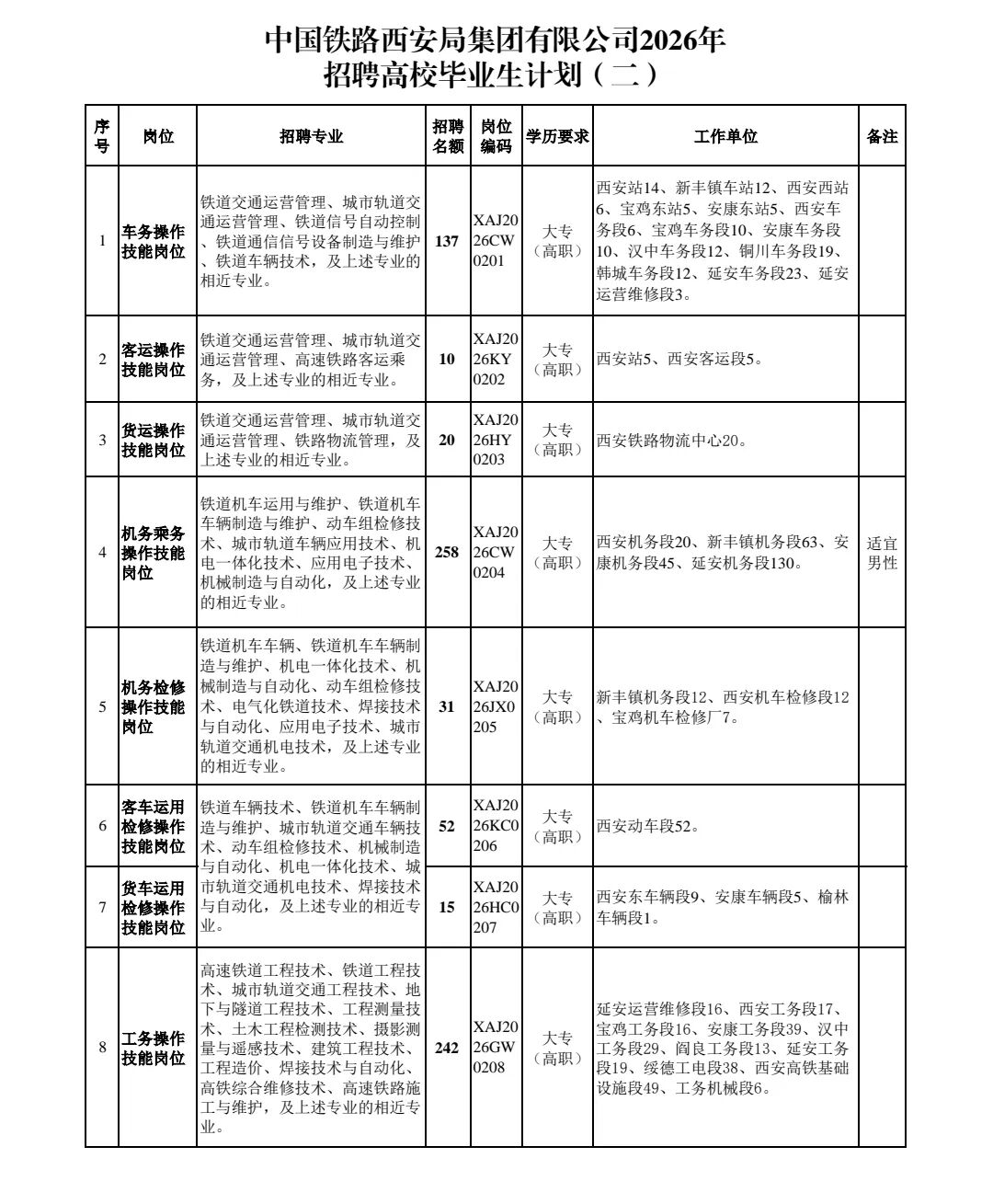 中国铁路西安局集团有限公司根据企业发展需求,拟采取校园招聘方式招聘全日制普通高校大专(高职)毕业生,现将有关事项公告如下: