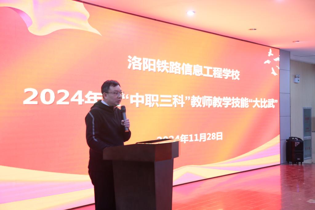 为充分发挥教学比赛的示范引领作用,促进我校教师用好国家统编版“中职三科”教材,提高课程设计能力和教学实践能力,持续深化课堂教学改革。11月28日下午,我校在思政大讲堂顺利举办2024年度“中职三科”教师教学技能大比武活动。校领导于庆斌、李文光、李力厚,各系部及相关科室负责人,各教研室主任及全校专兼职教师代表参加了本次活动。活动特别邀请了我校近年来省优质课评选一等奖获得者魏春燕、李传军、刘小波、赵璞担任评委。本次活动由教学工作部部长张波主持。